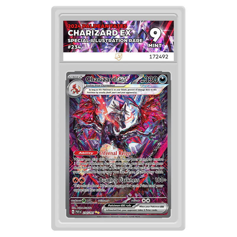 Unleash the power of Pokemon with Scarlet & Violet – Paldean Fates – Charizard ex! This graded slab (ACE Label 9) features a fierce Charizard ex (234/091) and exudes unbeatable style. Perfect for any trainer looking to add some fire to their collection. Gotta catch it now!